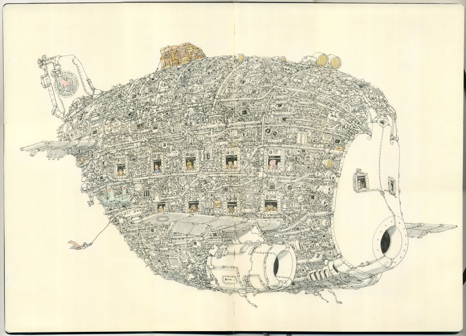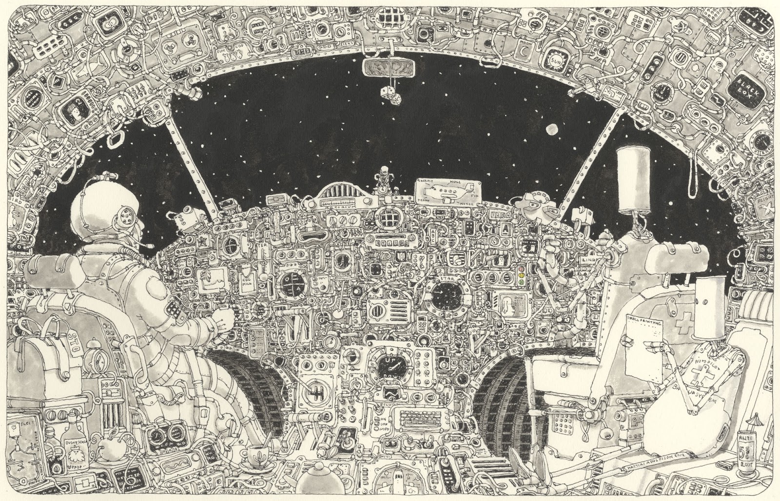 I love this illustration from Swedish artist Mattias Adolfsson, drawn on two pages of a Moleskine notebook. The incredibly dense scene (only a small fraction of it seen above) captures the perceived complexity of an airplane cockpit in the eyes of a child. You can zoom into the details of the 36 megapixel scan of the image here. Adolfsson also drew a view of the imaginary plane's exterior, as well as a similar second cockpit scene for a commission. The rest of his work is just wonderful stuff.